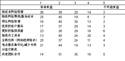 您認(rèn)為融合網(wǎng)絡(luò)將怎樣使您的企業(yè)受益(現(xiàn)在或者將來(lái))?請(qǐng)為每一項(xiàng)打1至5分,1表示非常有益,5表示不可能有益。(% 調(diào)查反饋者)