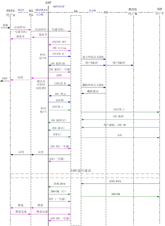 圖5為PSTN用戶A撥打一號通用戶,順呼軟交換域AG下POTS用戶B和SIP用戶C,其中軟交換和應用服務器以SIP協(xié)議相連,軟交換和AG、軟交換和TG以H.248協(xié)議相連?梢钥吹剑脩鬊首先振鈴,振鈴達到規(guī)定時間后,應用服務器取消了對用戶B的振鈴,轉而對用戶C振鈴。用戶C摘機應答,通話結束,用戶C掛機,系統(tǒng)釋放了呼叫。