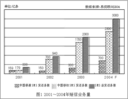 預(yù)計(jì)2004年的短信發(fā)送量將達(dá)到3000億條,其中中國移動(dòng)為2300億條,中國聯(lián)通為700億條,具體如圖1所示。并且,隨著用戶逐漸習(xí)慣使用SMS業(yè)務(wù),SMS用戶數(shù)占手機(jī)用戶數(shù)的比例會(huì)略有增加。