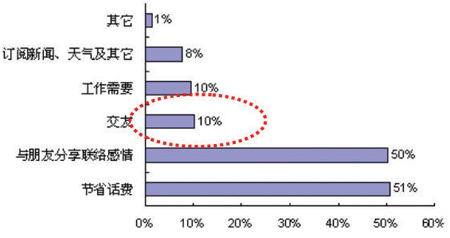 首先從使用目的看,我們的調(diào)查研究表明,大部分用戶使用短信最主要的目的是節(jié)省話費(fèi),該類用戶比例高達(dá)51%; 其次是與朋友分享,以及聯(lián)絡(luò)感情,比例為50%; 而其他如交友、工作需要、訂閱新聞、天氣及其他等所占比例較低,均不超過10%。由此可見,雖然短信業(yè)務(wù)已經(jīng)深入地滲透了用戶的生活,但是用戶的主要應(yīng)用仍然是點(diǎn)對(duì)點(diǎn)的應(yīng)用,信息類的應(yīng)用只占很小的部分(見圖2)。