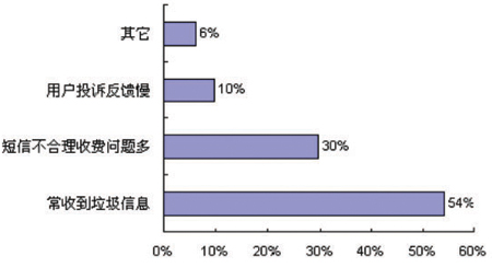 調(diào)研結(jié)果顯示,用戶對(duì)目前經(jīng)常收到垃圾信息表示不滿比例高達(dá)54%;其次是短信費(fèi)用問題,用戶的不滿意見也比較多,例如短信的訂閱與退訂,對(duì)于一些短信費(fèi)用的不合理收取、一些訂閱業(yè)務(wù)無法取消等等,該比例為30%;另外有10%左右的用戶對(duì)解決投訴的及時(shí)性和有效性表示了不滿。