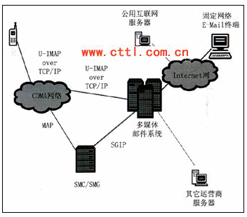 互聯(lián)網(wǎng)郵箱到聯(lián)通U-IMAP手機(jī)終端業(yè)務(wù)支持互聯(lián)網(wǎng)郵件用戶(hù)直接向手機(jī)終端用戶(hù)發(fā)送郵件,需要郵件服務(wù)器、U-IMAP Server以及移動(dòng)手機(jī)終端的支持,根據(jù)實(shí)際情況,有時(shí)還需要短信中心的支持,用于向移動(dòng)手機(jī)終端發(fā)送郵件到達(dá)的通知。郵件服務(wù)器與U-IMAP Server之間的協(xié)議采用SMTP協(xié)議,U-IMAP