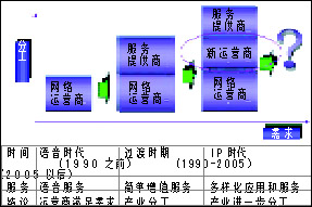 Switch(軟交換)、3G、IPv6等技術進行系統(tǒng)構筑,全面融合先進的語音、數(shù)據(jù)及移動通信IP一體化解決方案,從而為企業(yè)提供不同需求層次的選擇。另外,由此導致產(chǎn)業(yè)結構也悄悄地發(fā)生變化,產(chǎn)業(yè)朝三層級和多層級演變通信的新結構和新角色:服務運營商的誕生,網(wǎng)絡運營商向服務提供商的轉(zhuǎn)型。