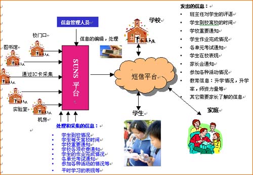 從上圖可以看到,在建立了SUNS校園綜合管理短信平臺(tái)以后,學(xué)生在校的活動(dòng)可以通過(guò)信息采集系統(tǒng)收集,在進(jìn)行后臺(tái)信息處理的同時(shí),建立一個(gè)與學(xué)生家庭直接溝通渠道。