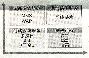 其中,互聯(lián)網(wǎng)及增值業(yè)務包括兩部分,核心業(yè)務主要是即時通信服務,包括傳輸文本信息、圖像、視頻、音頻以及會員服務、號碼服務、電子郵件等;另外還有娛樂資訊門戶的建設(shè),包括向用戶提供新聞、體育、娛樂等多類資訊,還包括游戲中心、交友中心、校友錄、電子賀卡等多種娛樂服務。