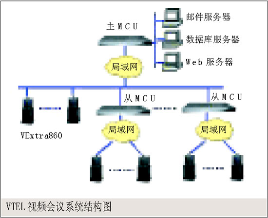 。。圖中各會(huì)議節(jié)點(diǎn)均配置一臺(tái)VTEL VExtra視頻會(huì)議終端,通過E1電路接入網(wǎng)絡(luò)中心的Meta