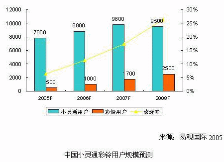 亞太領(lǐng)先的高科技智囊機(jī)構(gòu)-易觀國際最新推出的《固網(wǎng)增值業(yè)務(wù)研究系列報告-彩鈴彩話2005》中,易觀預(yù)測,2005年國內(nèi)小靈通彩鈴用戶總數(shù)將達(dá)到500萬戶,市場規(guī)模為1.7億元人民幣;到2008年,小靈通彩鈴用戶有望達(dá)到2,500萬戶,市場規(guī)模將超過21億元人民幣。