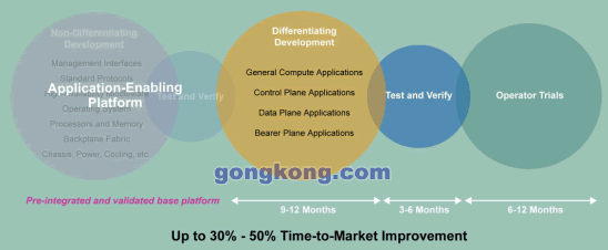 摩托羅拉將這種預集成并驗證的基礎(chǔ)平臺稱之為面向應用的平臺,采用這個方式可以極大的加快進入市場的速度,使TEM專注于開發(fā)自己產(chǎn)品的差異化功能與內(nèi)容;跇藴实钠脚_同時具有豐富的核心能力,從硬件,OS到高可用中間件與管理接口,它不是為單一應用而設(shè)計,而是為廣闊市場準備的通用平臺。