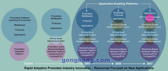 現(xiàn)在,許多TEM認識到他們可以通過預集成并驗證的面向應用平臺來極大地加速其開發(fā)周期,這一模式也加快了產(chǎn)業(yè)向標準演進的速度,全標準平臺可能將提前5年于2007年到來,如圖6所示。