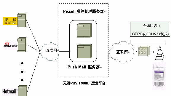 對于擁有便攜式計算機(jī)的用戶,在移動中,通過對其計算機(jī)進(jìn)行相應(yīng)的軟、硬件的配置,根據(jù)其所在地的可利用的資源,可以開啟便攜式計算機(jī)借助于GPRS、CDMA1x、WiFi無線或有線寬帶和撥號等手段上網(wǎng)訪問其EMAIL。而在沒有便攜式計算機(jī)或計算機(jī)關(guān)閉的情況下,PUSH MAIL系統(tǒng)可以在GPRS和CDMA1x廣泛的覆蓋范圍內(nèi)主動地將您的EMAIL"推"送到您的手機(jī)上,手機(jī)在接收到EMAIL后會發(fā)出提示音,使用戶可以在第一時間及時地閱讀到您的EMAIL及其附件。
