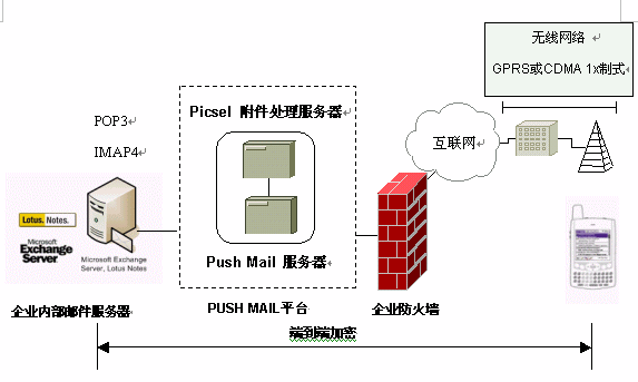 企業(yè)在其內(nèi)部放火墻內(nèi)安裝PUSH MAIL平臺,并在移動終端上安裝相應(yīng)的PUSH MAIL客戶端軟件,可以將企業(yè)郵箱用戶現(xiàn)有的EMAIL帳號延伸到手機(jī)上,不改變用戶的使用習(xí)慣,可以瀏覽郵件的附件。采用端到端的加密措施,確保郵件的安全性。
