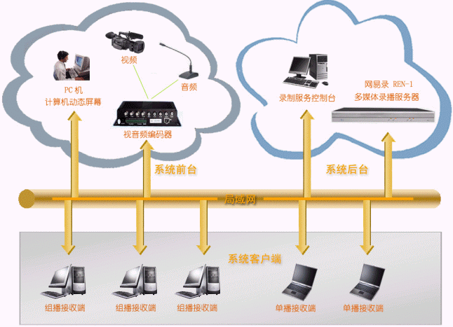 - 系統(tǒng)后臺:連接在網(wǎng)絡(luò)上即可,接受REN-1服務(wù)器管理端發(fā)送來的系統(tǒng)管理、維護(hù)指令,并負(fù)責(zé)將系統(tǒng)前臺發(fā)送來的視頻、音頻、計(jì)算機(jī)動態(tài)屏幕進(jìn)行實(shí)時(shí)錄制和直播,它包括:網(wǎng)易錄媒體中心(REN-1),它為系統(tǒng)的核心,主要完成視頻、音頻、計(jì)算機(jī)動態(tài)屏幕的錄制和直播;