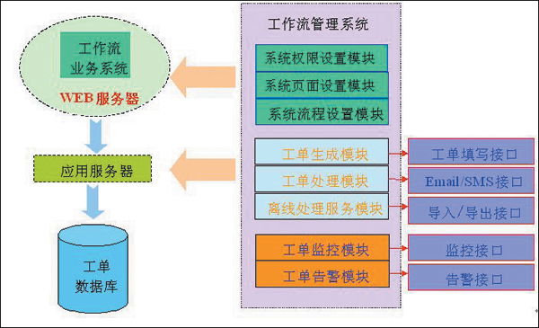 流程定制及參數(shù)設(shè)計模塊主要完成組織結(jié)構(gòu)、工號、權(quán)限設(shè)置、其他配置參數(shù)設(shè)置(如獲取工單的數(shù)據(jù)路由等)。工單的離線處理模塊用于離線時將工單以郵件的方式發(fā)送到處理人的郵箱中,然后由處理人脫機(jī)進(jìn)行處理,處理結(jié)果以郵件的方式發(fā)送到系統(tǒng)中,系統(tǒng)自動將郵件解析后合并到系統(tǒng)數(shù)據(jù)庫中,工單繼續(xù)進(jìn)入下一個處理環(huán)節(jié)。電子工作流系統(tǒng)提供多渠道投訴一體化的支持,