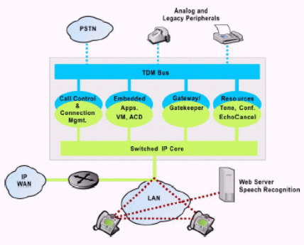 IP Enabled類IP-PBX的核心交換還是基于64K的傳統(tǒng)TDM交換網(wǎng)絡,由一條傳統(tǒng)TDM BUS進行控制,IP業(yè)務的支持需外接網(wǎng)關(可為內(nèi)置插板或外置模塊),其優(yōu)點與傳統(tǒng)TDM
