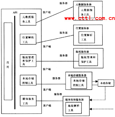 在DAVIC1.5AnytimeAnywhere文件中所規(guī)定的模型如圖2所示。在該圖中沒有描述任何與網(wǎng)絡(luò)相關(guān)的內(nèi)容。僅規(guī)定出在客戶端設(shè)備和服務(wù)器端設(shè)備中應(yīng)當包含的功能模塊。即:元數(shù)據(jù)服務(wù)、位置解析、版權(quán)管理和保護、本地存儲控制、媒體服務(wù)。其基本思想為,在服務(wù)器端提供的所有功能。在客戶端設(shè)備中應(yīng)包含有相關(guān)的軟件工具。在業(yè)務(wù)的具體實施過程中,客戶端首先向服務(wù)器端請求幫助查找其感興趣的媒體內(nèi)容,由元數(shù)據(jù)服務(wù)器處理并返回相關(guān)信息。通過位置解析服務(wù)器來確定客戶端所選擇的媒體內(nèi)容所在的位置;經(jīng)過媒體管理和保護服務(wù)器的認可:由本地存儲服務(wù)器向用戶提供媒體信息同時允許客戶端對媒體信息進行控制。