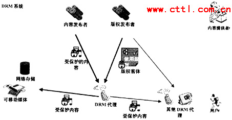 如圖4所示,DRM系統(tǒng)主要負責將內(nèi)容發(fā)布者發(fā)布的信息與版權(quán)發(fā)布者發(fā)布的信息組合起來將內(nèi)容變?yōu)槭鼙Wo的內(nèi)容,由版權(quán)客體提供使用規(guī)則,用戶在使用內(nèi)容時需要首先從DRM代理處根據(jù)使用規(guī)則獲得使用受保護內(nèi)容的密鑰,然后使用所獲得的密鑰對受保護的內(nèi)容進行解碼并使用。