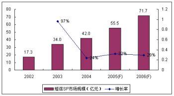 繼2004年中國(guó)政府和運(yùn)營(yíng)商監(jiān)管力度的加大,2005年的短信SP市場(chǎng)規(guī)模增長(zhǎng)率為32%,SP市場(chǎng)規(guī)模55.5億元,比2004年略有上升。基于目前短信市場(chǎng)增量市場(chǎng)的縮小,其增長(zhǎng)主要依靠對(duì)存量市場(chǎng)需求的深度挖掘。諾盛預(yù)計(jì)2006年的短信市場(chǎng)繼續(xù)保持平穩(wěn)的增長(zhǎng)勢(shì)頭,增長(zhǎng)率將達(dá)29%。