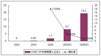 在運(yùn)營(yíng)商的大力推動(dòng)和SP/CP的積極努力下,無(wú)線音樂(lè)市場(chǎng)從2004年起進(jìn)入了井噴時(shí)期。CRBT業(yè)務(wù)具有的病毒式營(yíng)銷(xiāo)特性使得CRBT業(yè)務(wù)的滲透率增長(zhǎng)迅速,但其時(shí)尚特性又使得業(yè)務(wù)的滲透率高峰很容易達(dá)到、業(yè)務(wù)縱深有限。2005年,CRBT的SP市場(chǎng)規(guī)模增長(zhǎng)率為376%,較上一年的高速增長(zhǎng)有所回落。諾盛預(yù)計(jì)2006年運(yùn)營(yíng)商和SP/CP仍然會(huì)力推CRBT業(yè)務(wù)。在產(chǎn)業(yè)鏈積極推動(dòng)和用戶滲透率高峰已經(jīng)逼近的雙重制約下,諾盛預(yù)計(jì)CRBT業(yè)務(wù)的SP市場(chǎng)規(guī)模增長(zhǎng)率為138%,整體SP市場(chǎng)規(guī)模達(dá)到19.3億元。