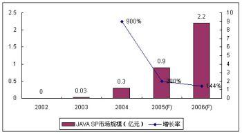作為SP和移動(dòng)運(yùn)營(yíng)商都非?春玫臉I(yè)務(wù),JAVA業(yè)務(wù)受到眾多SP的青睞。盡管作為JAVA主要業(yè)務(wù)的手機(jī)游戲目前盈利狀況普遍欠佳,但空中網(wǎng)、美通無(wú)線、數(shù)字魚(yú)等SP仍然大量投入,期待著未來(lái)業(yè)務(wù)的高速增長(zhǎng)。受制于終端和JAVA游戲的表現(xiàn)力,2005年JAVA業(yè)務(wù)的SP市場(chǎng)規(guī)模增長(zhǎng)率回落到200%,諾盛預(yù)計(jì)2006年JAVA的使用環(huán)境沒(méi)有太大變化,其增長(zhǎng)率進(jìn)一步回落至144%。