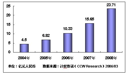 Research)數(shù)據(jù)表明,2005年,我國移動政務(wù)市場規(guī)模達6.82億元,增長率為51.6%,預(yù)計2006年,我國移動政務(wù)市場規(guī)模將達到10.33億元,預(yù)計未來三年內(nèi),中國移動政務(wù)復(fù)合增長率將達到51.5%,截至2008年,我國移動政務(wù)市場規(guī)模將突破20億元。