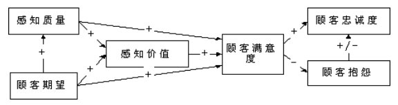 該模型是由六個隱變量組成的因果模型,其中顧客滿意度是最終要求的目標變量,感知質(zhì)量、感知價值和顧客期望是因變量,而顧客忠誠度和顧客抱怨則是顧客滿意與否的結(jié)果變量。