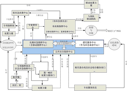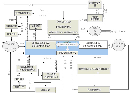 指政府決策指揮中心、先期指揮中心、便民服務中心、公共安全監(jiān)控中心,通常還有移動指揮中心和災備中心,以及其它節(jié)點的建設。一般地,先期指揮中心與便民服務中心可互為備份。政府決策指揮中心對重大、特別重大突發(fā)公共事件進行協(xié)調、決策,偏重于自然災害與生產(chǎn)安全方面,而一般、較重突發(fā)公共事件仍保持由各專業(yè)指揮部指揮、處置,只有當跨區(qū)、跨機構需要協(xié)調時由政府決策指揮中心進行協(xié)調。
