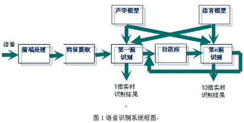 圖1所示為當前大多數語音識別系統采用的框架和流程。原始語音經前端處理后,從中提取出若干維的特征向量用于識別。識別時,聲學模型和語言模型共同作用,得到使某一概率最大的字串作為識別結果。
