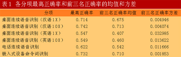 從各分項前三名的正確率方差可以看出,漢語桌面連續(xù)語音識別和嵌入式設備命令詞分項中各系統的性能差異較小,而英語桌面連續(xù)語音識別,特別是一倍實時任務中各系統性能差異較大。這是因為當前語音識別的研究重點在于前者,研究者較多,研究也比較深入,而英語的識別相對來說研究者較少。