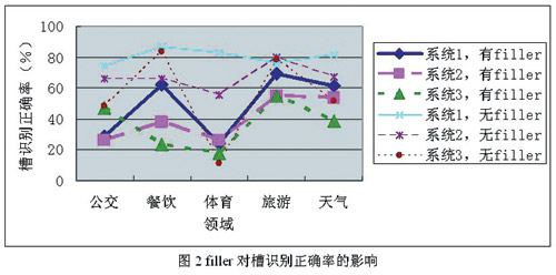 對于電話連續(xù)語音識別來說,由于錄制環(huán)境是辦公室真實環(huán)境,因此噪音并不是影響性能的主要因素。電話連續(xù)語音識別分為5個子領域,每個子領域各有一套語法。評測句子由語法生成的有效成分在前后加上任意長的填充詞(filler)構成,如語法生成的句子為“從天安門到中關村怎么坐公交車”,而實際錄制的句子是“你好,請問從天安門到中關村怎么坐公交車,可以查到嗎?”,其中的“你好,請問”和“可以查到嗎”就是filler。由分析可以發(fā)現,不同領域內的槽識別正確率相差很大。這主要有兩個原因,一是不同領域的語法復雜度不同,二是不同領域內有filler的句子所占比例不同。為了進一步衡量filler對識別的影響,選取三個識別系統,將有filler的句子和沒有filler的句子分別計算識別率,統計結果如圖2所示。從圖中可以看出,filler對識別的影響是相當大的,無filler的句子比有filler的句子識別正確率可以高幾十個百分點。