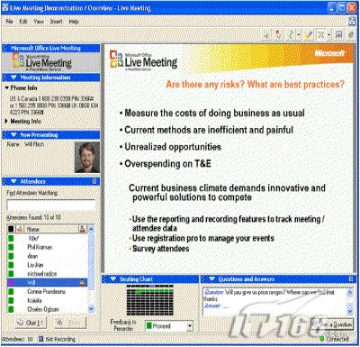 Microsoft Office Live Meeting實(shí)時(shí)會(huì)議:它使Web會(huì)議變得容易,它提供一個(gè)互動(dòng)的Web空間進(jìn)行會(huì)議。在Web空間上面,參會(huì)人員能共享文件、音頻視頻流、以及協(xié)同工作。通過(guò)Live