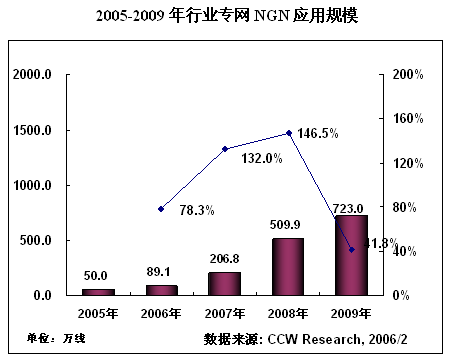 在運營商N(yùn)GN建設(shè)高速增長的同時,政府、能源、交通等行業(yè)專網(wǎng)NGN建設(shè)也逐漸步入快車道。NGN在行業(yè)專網(wǎng)的應(yīng)用,到2005年底的應(yīng)用規(guī)模達(dá)到50萬線,根據(jù)計世資訊(CCW Research)《2005-2006中國NGN產(chǎn)業(yè)應(yīng)用趨勢研究報告》的預(yù)測,未來4年,NGN在行業(yè)專網(wǎng)市場將以95%的復(fù)合增長率高速增長。