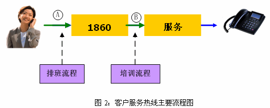 因此,根據(jù)客戶服務中心的實際情況,我們首先優(yōu)化了排班流程,建立并優(yōu)化了培訓流程。我們首先選擇這兩個流程的思路如下:從客戶角度來看,10086熱線在接受用戶咨詢服務時的主要流程如下:撥號→1860→服務提供→掛機。圖示如下: