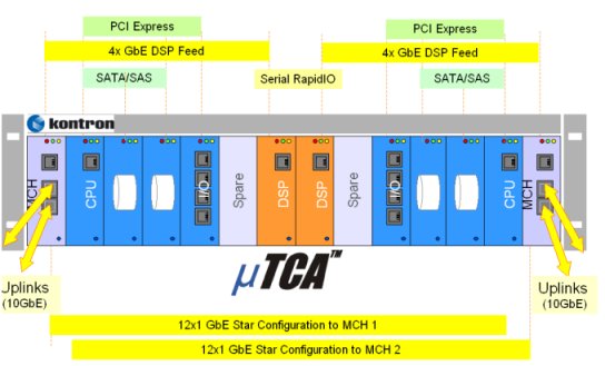 圖中ATCA系統(tǒng)適用于高性能呼叫服務(wù)器、IMS服務(wù)器及應(yīng)用服務(wù)器。除了緊湊的機箱結(jié)構(gòu),它還可以使用AMC模塊,如用存儲模塊擴展存儲能力,用DSP模塊處理媒體流。