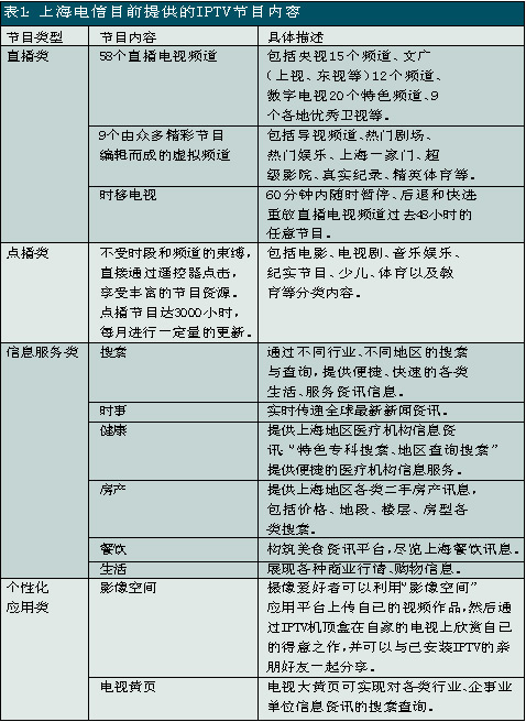 上海電信是國內(nèi)關(guān)注并切入IPTV業(yè)務(wù)較早的電信運(yùn)營商之一,自2005年就開始積極測試和試驗(yàn)。此次上海電信在全上海市范圍內(nèi)推出IPTV業(yè)務(wù),被業(yè)界看作是“中國IPTV規(guī)模商用的新紀(jì)元”。除了影視節(jié)目收看、視頻內(nèi)容點(diǎn)播、時(shí)移功能外,上海電信的IPTV服務(wù)還包括時(shí)事新聞、遠(yuǎn)程醫(yī)療、視頻房產(chǎn)信息、餐飲信息、天氣預(yù)報(bào)、票務(wù)查詢等信息服務(wù)以及可視電話、IPTV游戲等個(gè)性化應(yīng)用。其中IPTV的直播頻道有58個(gè),視頻點(diǎn)播可選節(jié)目量達(dá)3000小時(shí)以上。另外,上海電信還推出了影像空間和電視大黃頁等應(yīng)用服務(wù),攝像愛好者可以利用“影像空間”應(yīng)用平臺(tái)上傳自己的視頻作品,然后通過IPTV機(jī)頂盒在自家的電視上欣賞自己的得意之作,并可以與已安裝IPTV的親朋好友一起分享;電視大黃頁可實(shí)現(xiàn)對各類行業(yè)、企事業(yè)單位信息資訊的搜索查詢。
