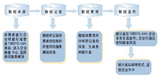 "企業(yè)客戶服務(wù)系統(tǒng)"統(tǒng)計數(shù)據(jù)分析功能,能幫助企業(yè)管理人員適時監(jiān)控"企業(yè)客戶服務(wù)系統(tǒng)"的運(yùn)行情況,自動采集消費(fèi)者在使用"企業(yè)客戶服務(wù)系統(tǒng)"過程的相關(guān)數(shù)據(jù),并分類整理成數(shù)據(jù)庫,為企業(yè)經(jīng)理人投資決策提供重要的數(shù)據(jù)支持。企業(yè)經(jīng)理人只需登陸客戶服務(wù)網(wǎng)站www.168315.com,按照"168315客戶服務(wù)中心"提供的用戶名和密碼登錄,即可隨時下載"企業(yè)客戶服務(wù)系統(tǒng)"的運(yùn)行數(shù)據(jù),瀏覽客戶檔案庫。也可以由"中心"的服務(wù)人員將統(tǒng)計結(jié)果通過E-mail、傳真或郵寄的方式送到企業(yè)經(jīng)理人手中,如下圖: