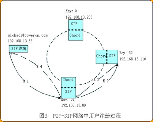 Key值為32的PN收到REGISTER請求后,取得請求中To頭域里的SIP URI(michael@powercn.com),調(diào)用find_responsible_pn(user)。返回值是192.168.13.110:5060,比較后發(fā)現(xiàn)是自己,說明自己負責管理該用戶,負責處理該用戶的注冊請求。之后的處理流程遵循SIP標準。假定注冊成功,PN返回200 OK應答。如圖3中M3所示。應答的返回遵循SIP標準,根據(jù)Via頭域按原路返回,不需要查找路徑,不會使用Chord層的操作。