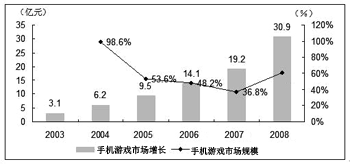 國內(nèi)手機(jī)游戲市場(chǎng)在過去的幾年里呈現(xiàn)快速發(fā)展的趨勢(shì)。2004年增長(zhǎng)率接近100%,2005年也有50%以上的增長(zhǎng)。但最近兩年國內(nèi)整個(gè)手機(jī)游戲市場(chǎng)隨著手機(jī)普及率的增速放緩也進(jìn)入了盤整期。iResearch咨詢估計(jì),從2005年至2007年,國內(nèi)手機(jī)游戲市場(chǎng)的收入規(guī)模盡管仍然處于上漲趨勢(shì),但年增長(zhǎng)率逐年下降,2008年后隨著市場(chǎng)環(huán)境更加成熟理性,年增長(zhǎng)率將會(huì)出現(xiàn)反彈,升至60%以上。
