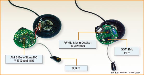 SIW3500GIG1可以處理包含人機界面在內所有上層和下層堆棧的藍牙交互指令;還可運行免提算法,包括音頻/視頻遙控和高級音頻分配(A2DP)協(xié)議規(guī)范。另外還有一個來自AMIS公司的輔助芯片Bela-Signa200。該芯片采用MLF封裝,提供A2DP規(guī)范要求的子頻段編解碼器解碼功能,還能運行某些音頻增強算法。