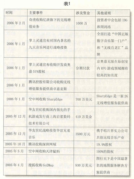從2003年開始,國內(nèi)就顯現(xiàn)出并購增值服務(wù)運營企業(yè)的苗頭。2004年以來,隨著整治增值服務(wù)運營企業(yè)的力度不斷加大,并購漸成風潮(見表1)。2004年2月,新浪收購深圳網(wǎng)興科技公司;2004年5月,搜狐收購手機WAP服務(wù)提供商北京吉菲爾公司。2005年,在“超級女生”節(jié)目大獲成功后,掌上靈通宣布將對國內(nèi)著名的九天音樂網(wǎng)進行戰(zhàn)略投資,全面打造“中國正版數(shù)字音樂第一門戶”和“無線百老匯”品牌。各大移動增值業(yè)務(wù)服務(wù)商通過并購競爭對手,門戶網(wǎng)站可以在移動增值服務(wù)領(lǐng)域?qū)で笮碌耐黄疲@得可觀的利益,增強自身的競爭力。伴隨著3G商用的日益臨近和市場競爭的不斷加劇,主流SP(服務(wù)提供商)進一步加快了資本購并和業(yè)務(wù)整合的步伐,整個SP行業(yè)將加速洗牌。經(jīng)過市場整合,主流SP將不斷做大做強,而相當多的缺乏市場競爭力的SP將被淘汰出局。