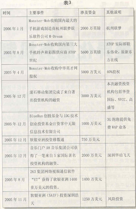 近幾年來,一些資本投資商將投資的重點放到了無線音樂、手機游戲和手機視訊等業(yè)務(wù)領(lǐng)域,逐步加大了對SP的投資力度(見表3)。進入2005年以來,著眼于2.5G向3G的全面演進,風險投資對SP的投資力度進一步加大。以滾石移動為例,在2002年和2004年獲得兩輪風險投資之后,滾石移動憑借在無線音樂領(lǐng)域取得的良好市場業(yè)績,又獲得了智基創(chuàng)投、華登國際、聯(lián)想投資等公司的投資,投資金額達3000萬美元。繼2004年10月獲得IDG投資以后,2005年12月7日,國內(nèi)著名的數(shù)字音樂門戶——A8音樂集團獲得了包括IDG和Intel投資公司在內(nèi)的5家國際著名投資機構(gòu)的投資,投資金額達2000萬美元。同月,掌中無限則獲得了來自全球性風險投資商BlueRun創(chuàng)投基金和IDG總額達上千萬美元的投資。