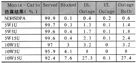 通過(guò)表3可以看出,隨著HSDPA功率分配的增加,網(wǎng)絡(luò)阻塞率和下行鏈路功率過(guò)載隨之增加,特別是功率增加到10W時(shí),增加幅度尤為明顯;在一定的HSDPA功率分配前提下,隨著網(wǎng)內(nèi)HSDPA用戶數(shù)的增加,網(wǎng)絡(luò)阻塞率和下行鏈路功率過(guò)載隨之增加,特別是用戶數(shù)增加到15人時(shí),增加幅度尤為明顯?梢(jiàn)HSDPA網(wǎng)絡(luò)性能在一定程度上受限于HSDPA功率分配和網(wǎng)內(nèi)HSDPA用戶數(shù)。