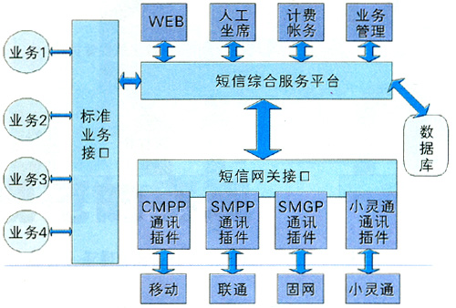 業(yè)務(wù)管理平臺(tái)是為運(yùn)營(yíng)商提供的可快速啟動(dòng)各種數(shù)據(jù)業(yè)務(wù)的平臺(tái),具有強(qiáng)大的資源調(diào)度能力。它連接運(yùn)營(yíng)商的基礎(chǔ)網(wǎng)絡(luò)和業(yè)務(wù)支撐系統(tǒng)(客服系統(tǒng)、計(jì)費(fèi)系統(tǒng)),為服務(wù)提供商/內(nèi)容提供商們提供各種移動(dòng)資源(如短信息中心資源、用戶信息資源、語(yǔ)音資源等)、功能資源(如單點(diǎn)認(rèn)證、計(jì)費(fèi)、漫游控制等)及各種公共的資源引擎(如地理位置、語(yǔ)音交互、推送信息等)。業(yè)務(wù)支撐系統(tǒng)是運(yùn)營(yíng)商為了開(kāi)展業(yè)務(wù)必須建設(shè)的客服系統(tǒng)、營(yíng)業(yè)系統(tǒng)、計(jì)費(fèi)系統(tǒng)等子系統(tǒng)。圖3是目前常用的綜合短信平臺(tái)[3]。
