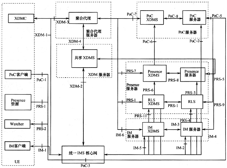 OMA雖然定義了XDM、Presence(呈現(xiàn))、Instant Message和PoC等業(yè)務(wù)的功能實(shí)體和參考點(diǎn),但是為了在網(wǎng)絡(luò)中實(shí)現(xiàn)以上業(yè)務(wù),需要將OMA定義的功能實(shí)體和參考點(diǎn)映射成物理實(shí)體和協(xié)議,確定運(yùn)營商開放此類業(yè)務(wù)對設(shè)備和協(xié)議的要求,圖2給出了一種映射的方式。XDM服務(wù)器包含的共享XDMS功能提供公共群組的能力,有利于用戶在使用PoC、IM等業(yè)務(wù)時也能共享此群組。