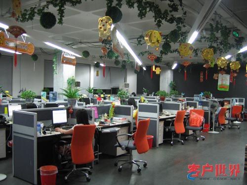 整個(gè)服務(wù)現(xiàn)場(chǎng)的裝修以桔黃色為主色調(diào),代表溫暖、和諧;格局不規(guī)則化,盡顯現(xiàn)代時(shí)尚的風(fēng)格;辦公室到處是綠色植物,墻上貼滿(mǎn)了各種相片、海報(bào)和宣傳語(yǔ),天花板掛滿(mǎn)了激勵(lì)口號(hào)板;別具特色的洗手間文化;乒乓球室、休息室、休閑吧,咖啡機(jī)、茶葉、果汁、雪糕、飲料,魚(yú)缸、大液晶電視、音響……一點(diǎn)感覺(jué)不到這是一個(gè)枯燥的呼叫中心的工作環(huán)境。