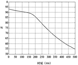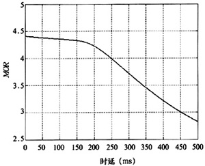 對實(shí)時(shí)的語音和視頻業(yè)務(wù)來說,業(yè)務(wù)數(shù)據(jù)端到端的時(shí)延最為關(guān)鍵,從仿真結(jié)果圖6和圖7可以看出時(shí)延對R系數(shù)和MOS值的影響:隨著時(shí)延的增加,R系數(shù)和MOS值都降低,即語音質(zhì)量變差。當(dāng)時(shí)延大于150ms時(shí),語音質(zhì)量下降的比較厲害。