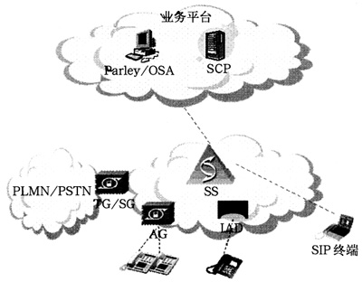 直接由SoftSwitch提供業(yè)務(wù),可提供基本電話業(yè)務(wù)、補(bǔ)充業(yè)務(wù)等;SoftSwitch具備SSP功能,通過(guò)SG與現(xiàn)網(wǎng)SCP互通,提供現(xiàn)有智能網(wǎng)業(yè)務(wù);SoftSwitch與應(yīng)用服務(wù)器之間通過(guò)SIP、H.323、Radius等協(xié)議互通;通過(guò)Parlay-GW/OSA-GW提供API接口,為第三方提供業(yè)務(wù)開(kāi)發(fā)平臺(tái)。