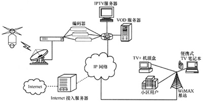 。。WiMAX網(wǎng)絡(luò)支持豐富多彩的業(yè)務(wù)模式。不同速率的數(shù)據(jù)業(yè)務(wù)是網(wǎng)絡(luò)的主要承載目標(biāo)。WiMAX支持不同的QoS級別,因此網(wǎng)絡(luò)覆蓋范圍與業(yè)務(wù)類型緊密相關(guān)。在IPTV的接入方面,由于IPTV需要高級別的QoS保證以及高速的數(shù)據(jù)傳輸速率,所以根據(jù)小區(qū)內(nèi)用戶的數(shù)量以及需求,合理設(shè)置WiMAX網(wǎng)絡(luò)。用戶接入IPTV網(wǎng)絡(luò)的時候。不需要再次進(jìn)行布線,只需加裝WiMAX接收設(shè)備和IP機頂盒即可,因此用戶可以方便、快捷地使用IPTV業(yè)務(wù)。WiMAX實現(xiàn)IPTV的接入如圖1所示。