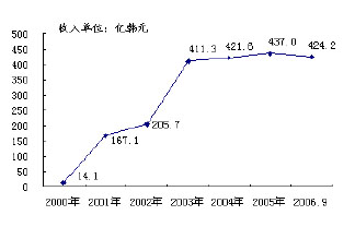 經(jīng)過6年多的運營,韓國電信的eBilling業(yè)務(wù)發(fā)展良好,目前與其合作的ICP已達到500多家,內(nèi)容涵蓋了收費郵箱、在線軟件銷售、聊天、娛樂、游戲、漫畫、綜合信息等;業(yè)務(wù)收入也逐年上升,從2000年的14.1億韓元(折合人民幣0.11億元)增長到2006年9月份的424.2億韓元(折合人民幣3.3億元),如圖2、圖3所示。
