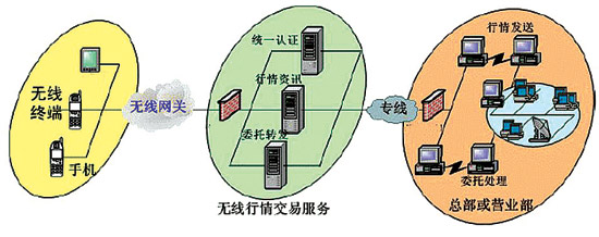 從技術(shù)上說,“移動(dòng)交易廳”主要采用WAP及專用手機(jī)客戶端方式,客戶可以通過訪問證券公司專門申請(qǐng)的域名(如廣發(fā)證券公司的http://wap.gf.com.cn),鏈接到證券公司的WAP手機(jī)炒股系統(tǒng)服務(wù)器,下載手機(jī)客戶端軟件,然后通過無(wú)線接入網(wǎng)關(guān)登錄到移動(dòng)證券業(yè)務(wù)平臺(tái)。移動(dòng)證券業(yè)務(wù)平臺(tái)的行情及委托交易系統(tǒng)完全利用現(xiàn)有的網(wǎng)上交易系統(tǒng)的資源。