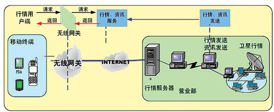 無(wú)線終端的請(qǐng)求通過各無(wú)線網(wǎng)絡(luò)進(jìn)入移動(dòng)證券系統(tǒng)的無(wú)線接入網(wǎng)關(guān),經(jīng)無(wú)線網(wǎng)關(guān)轉(zhuǎn)發(fā)至移動(dòng)交易行情服務(wù)平臺(tái)。如果是讀取行情資訊,行情服務(wù)平臺(tái)直接提供行情資訊服務(wù);如果是進(jìn)行委托交易,由委托接入服務(wù)器將委托數(shù)據(jù)轉(zhuǎn)發(fā)到總部或營(yíng)業(yè)部,再由總部或營(yíng)業(yè)部交易處理服務(wù)平臺(tái)進(jìn)行處理。換句話說,在無(wú)線網(wǎng)關(guān)接入后,其后的委托服務(wù)、行情服務(wù)都可采用現(xiàn)有的網(wǎng)上交易的通道和系統(tǒng)。